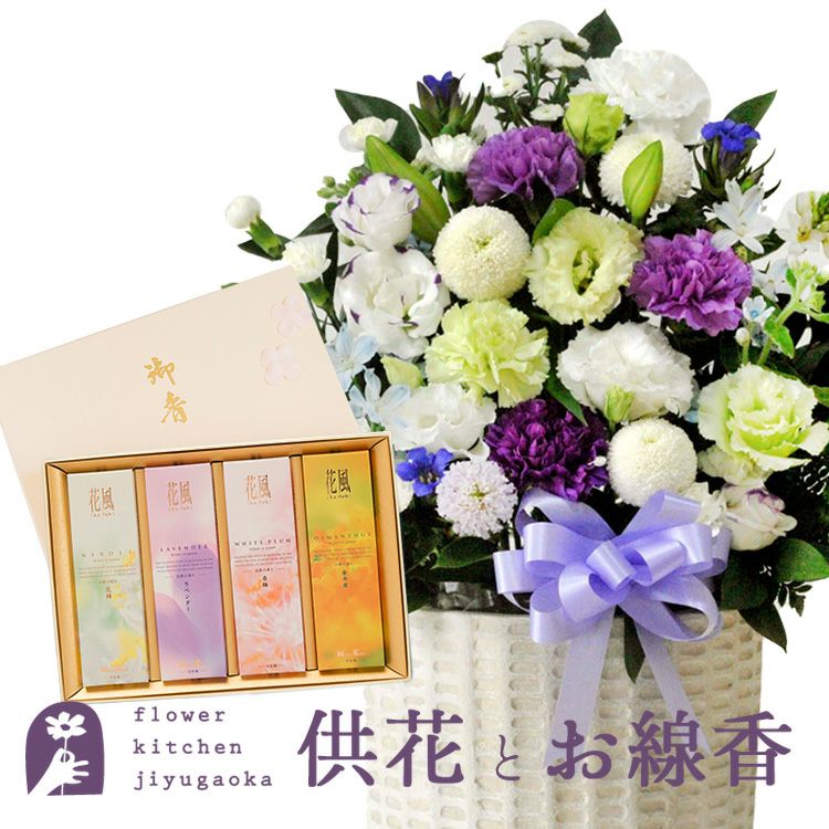 洋花を使った旬のおまかせ お供え花「風月アレンジ」+花風4種のお線香セット 生花 FKAASE