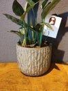 樹皮のようなテクスチャが印象的な陶器製の器に植え込まれています。自然素材のような素朴な風合いが、スキスマトグロッティスの落ち着いた葉姿とよく調和し、ナチュラルインテリアにもおすすめです。
