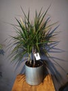 スタイリッシュなメタルポットに植え付けています。シャープな葉姿との相性が良く、全体として無機質なモダンさと植物の生命感がバランスよく融合しています。オフィスやシンプルなインテリアにもなじみやすいデザインです。