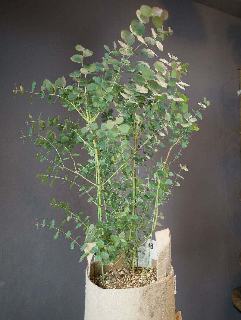 ルーツポーチ(不織布製)を使用しています。通気性・排水性に優れた茶色のバッグ型ポットで、根の蒸れを防ぎます。ナチュラルでカジュアルな風合いが、ユーカリのやさしい葉色とよく調和します。