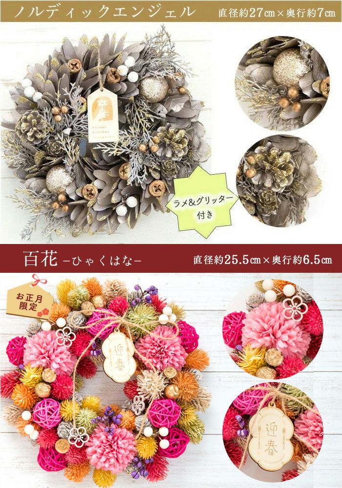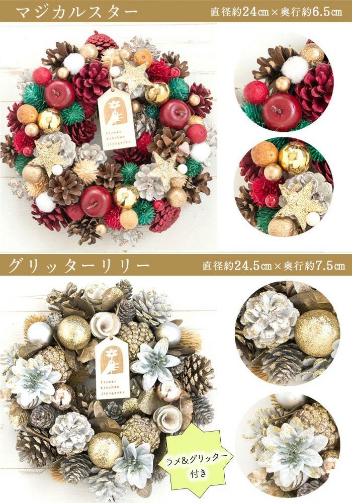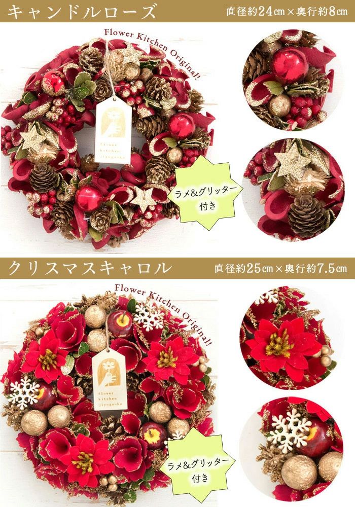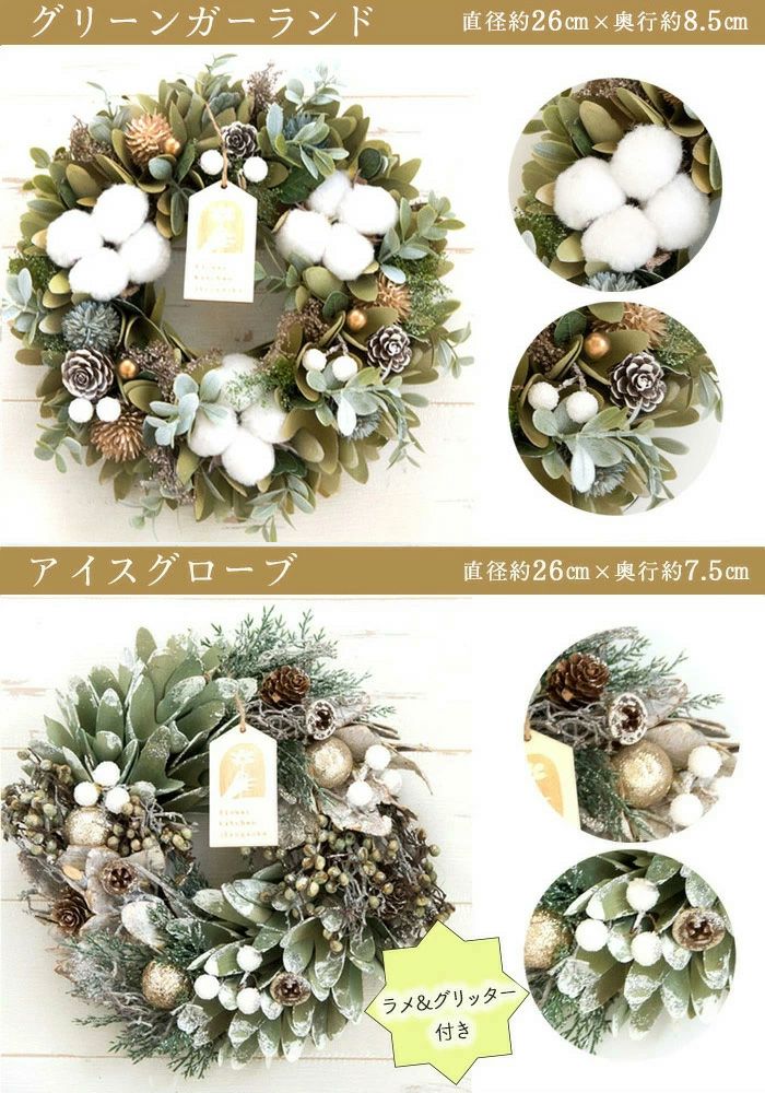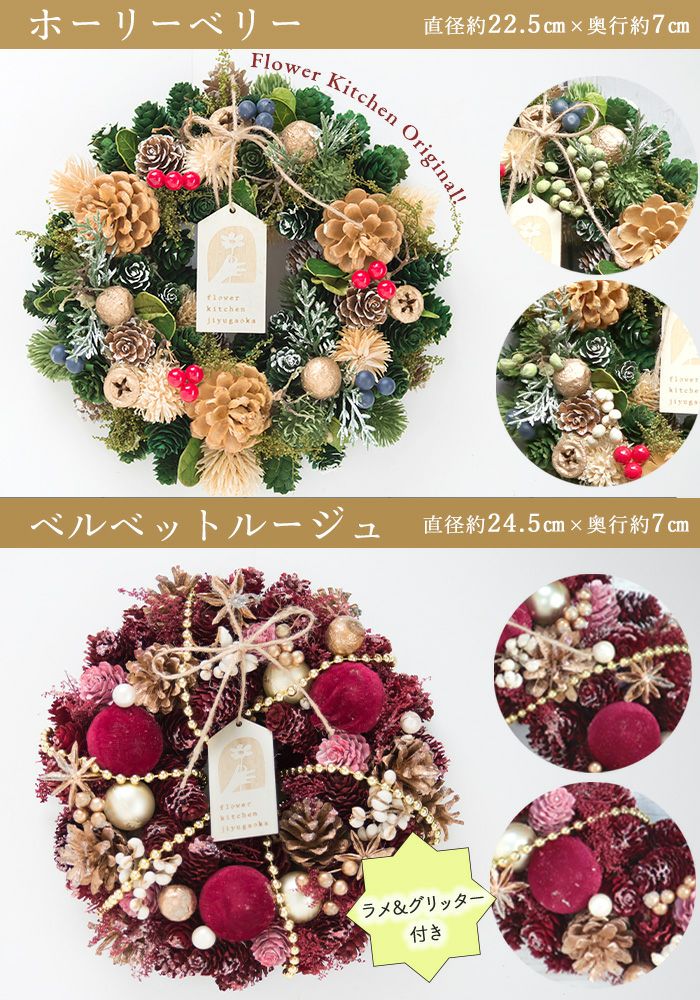 木の実やリボンをあしらったナチュラルなデザインから、赤とゴールドの華やかなタイプまで。