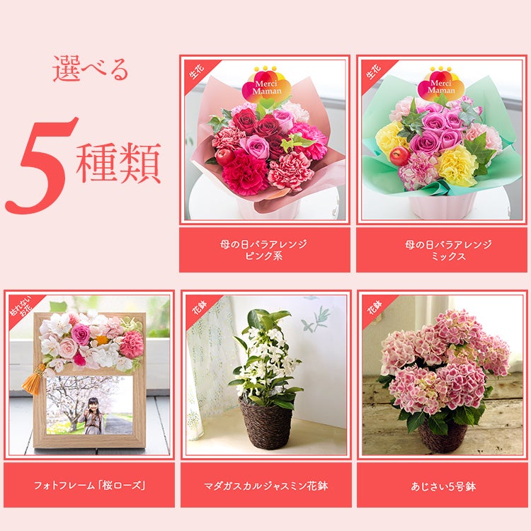 人気ランキング、予算別、種類別、好きな花・年代別から選べるので、お母さんにぴったりのプレゼントが見つかります。