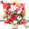 バラとユリを使ったクリスマスバージョンのフラワーアレンジメント。