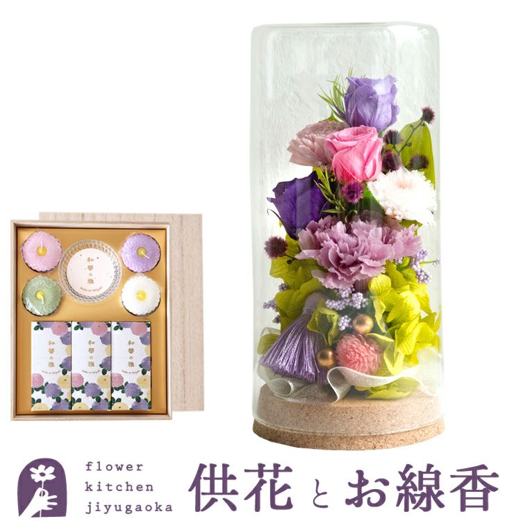 お供えプリザーブドフラワー「和心」パープルミックス+『和華の雅』線香セット FKTPOSE
