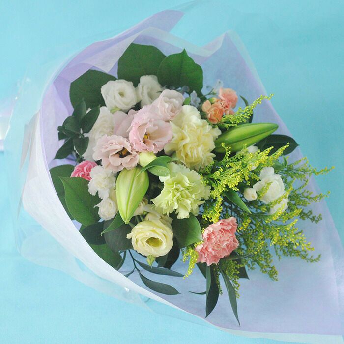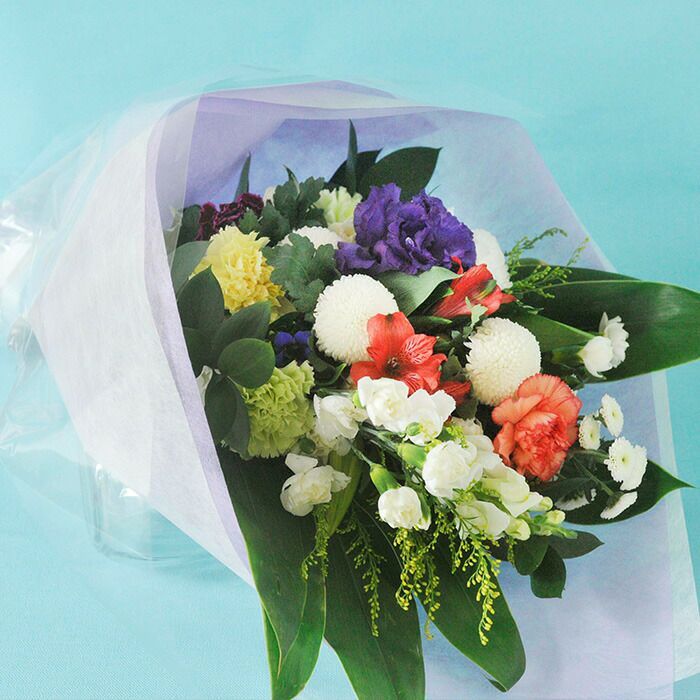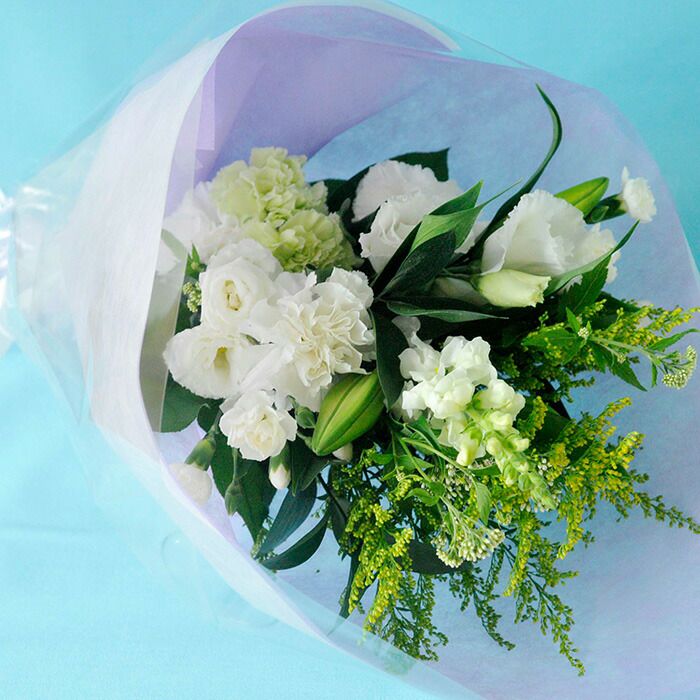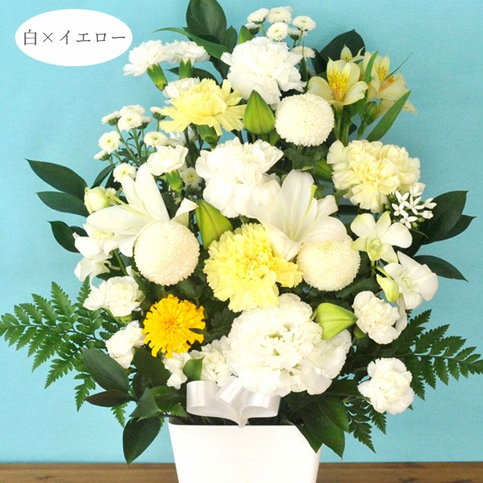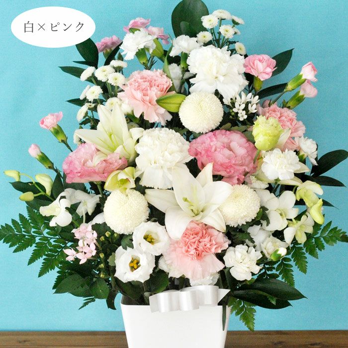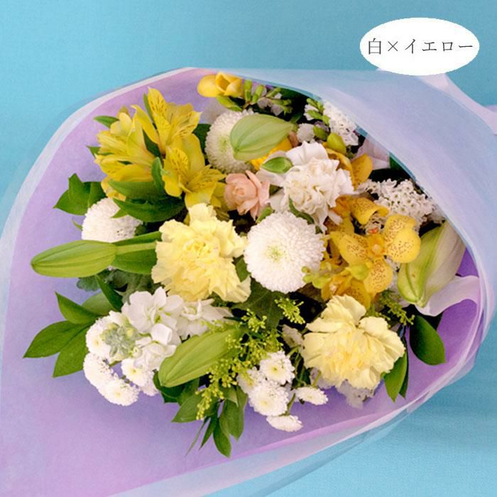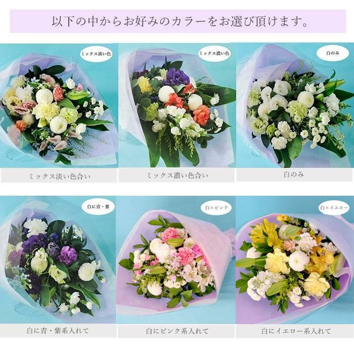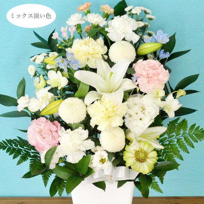 ⇒故人様のお好きだったお花や故人様をイメージするような淡い色などでお作りし、 ご遺族様の心の慰めとなるようなお花をお作りすることが可能でございます。 真っ白なお花ももちろん美しく、失礼に当たりませんが、お花によっては 少しさみしく感じられます。 四十九日以降でしたら多少の色を入れても良いかと思われます。