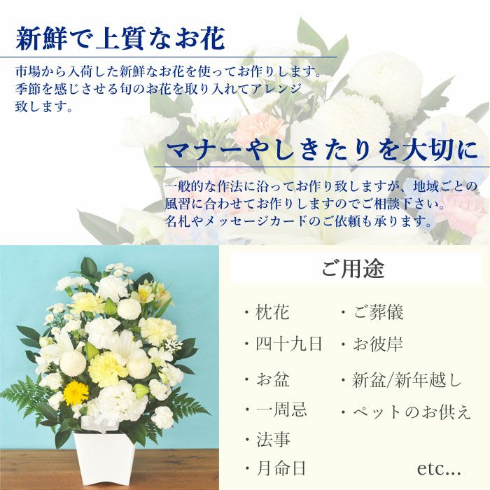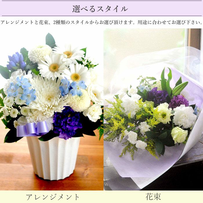 初七日以降もご家族構成、飾られる場所などを考慮して選べればベストです。 どちらでもよい、わからない といった場合はアレンジメントが無難です。