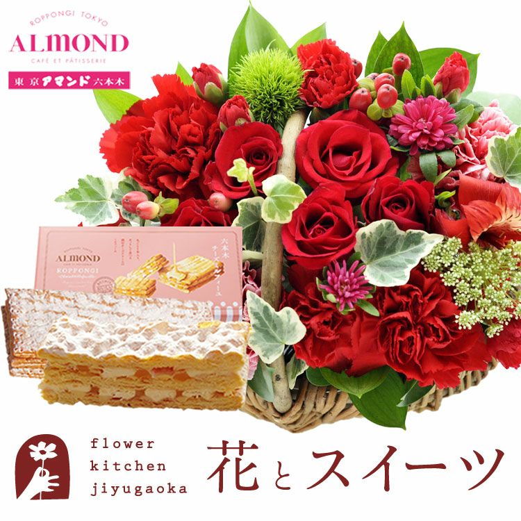 ミニョンバスケット【レッド】+「アマンド」チーズミルフィーユセット 生花 FKAASW