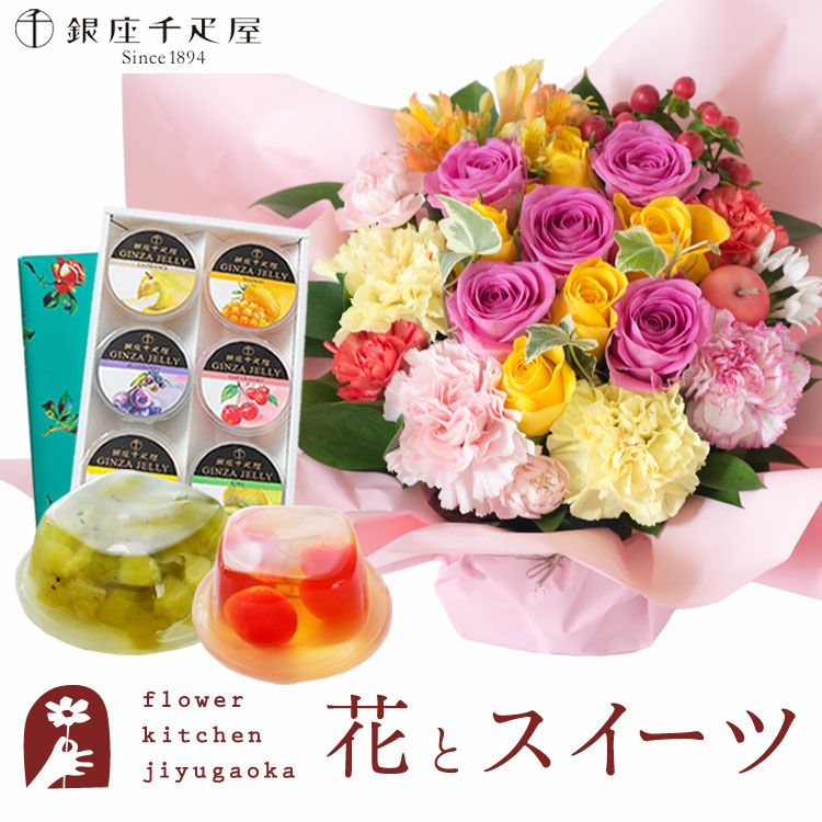 ロゼットアレンジ「ピンクイエロー」+【銀座千疋屋】銀座ゼリー6個入りセット 生花 FKAASW