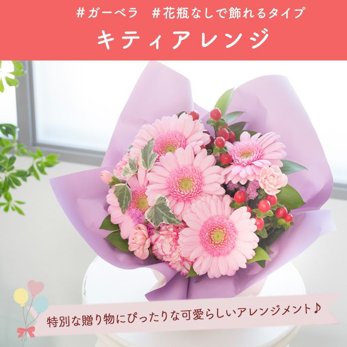 A: ガーベラ、ピンクのバラ、トルコキキョウが特に人気です。華やかさとかわいらしさのバランスが良く、贈る相手に合わせてアレンジしやすいお花です。