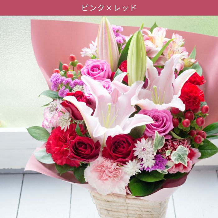 特にこだわりがない場合や、花で表現しにくい色を好まれる場合は、ピンク・黄色・オレンジなどの明るい色味を選ぶと、お祝いの気持ちが伝わります。