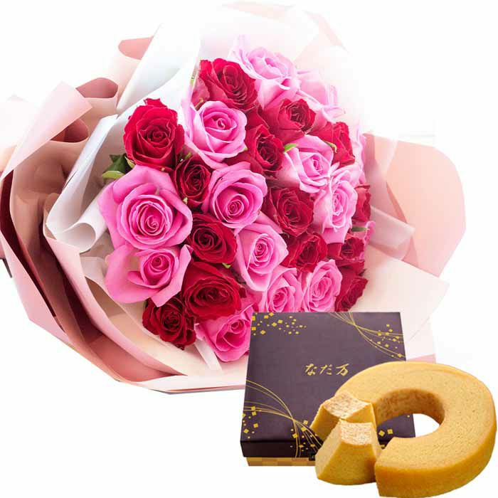 30本バラ花束「レッド×ピンク」+なだ万監修 和三盆バウムクーヘン 生花 FKAASW