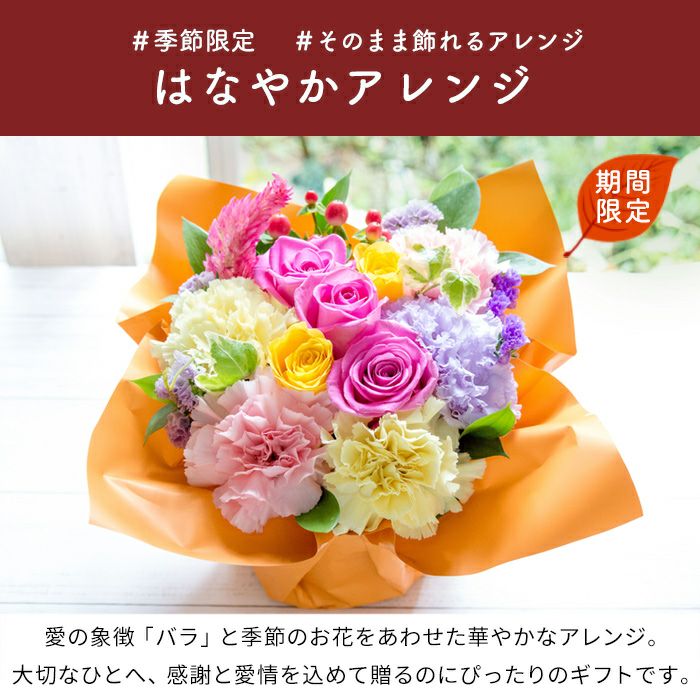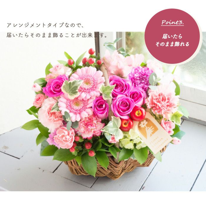 フラワーアレンジメントは、花瓶がなくてもそのまま飾れるのが魅力。