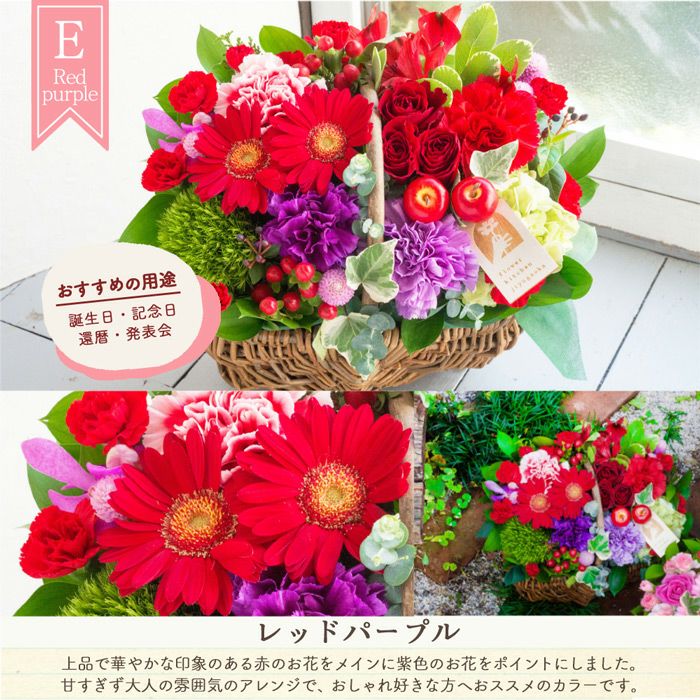 赤・紫・黄・白など、年齢ごとのテーマカラーを取り入れた花束やアレンジは、健やかなこれからを願う特別な贈り物に。