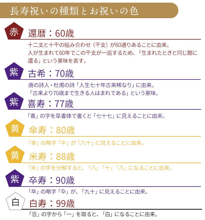 長寿のお祝いには、それぞれの年齢にちなんだテーマカラーがあります。