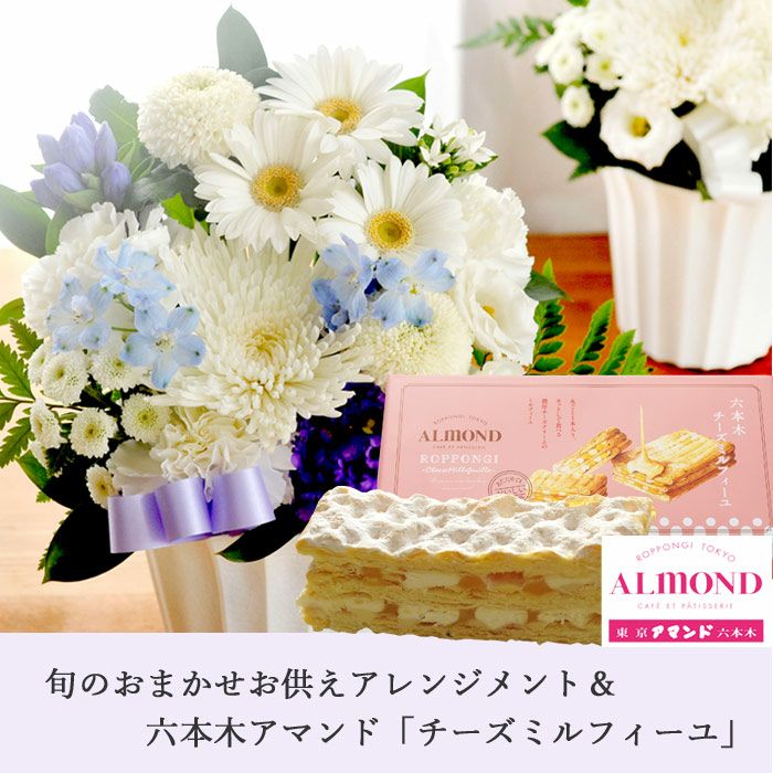 お供え花とお菓子をセットでお届けします。お盆やお彼岸のお供えに。