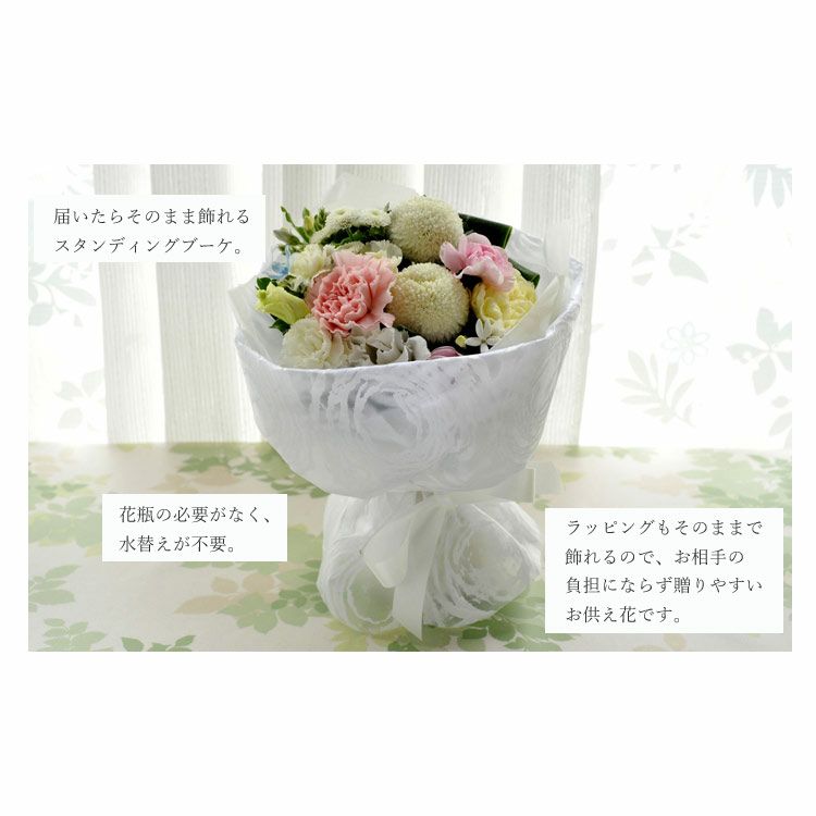 花瓶不要で手軽に供養でき、やさしい色合いの花々が心を和ませてくれます。