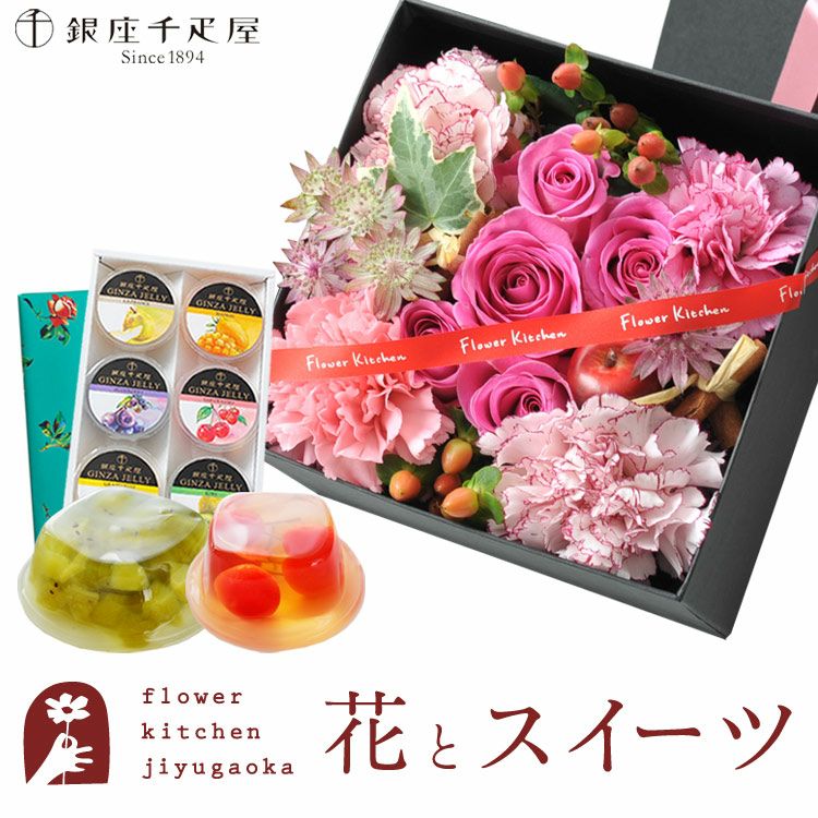 花とスイーツのセット♪四角BOXLサイズアレンジメント+【銀座千疋屋】銀座フルーツゼリー6個入りセット 生花 FKAASW