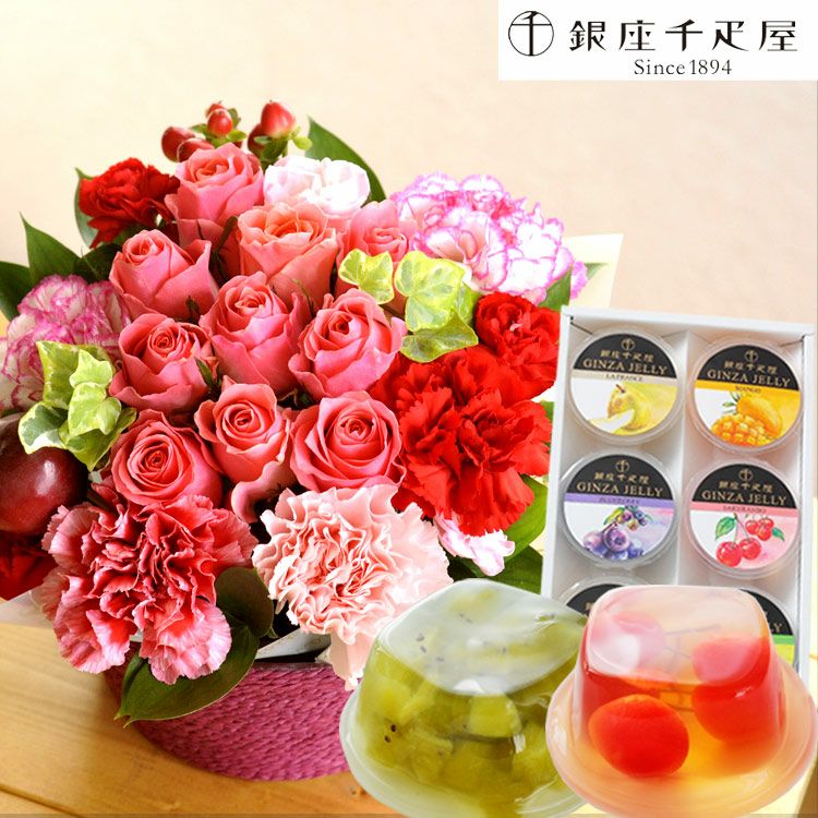 ローズガーデンアレンジと【銀座千疋屋】銀座ゼリー6個入りセット  生花 FKAASW