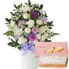 洋花を使った旬のおまかせ お供え花「かすみアレンジ」+六本木アマンド「チーズミルフィーユ」 生花 FKAASW