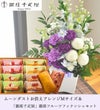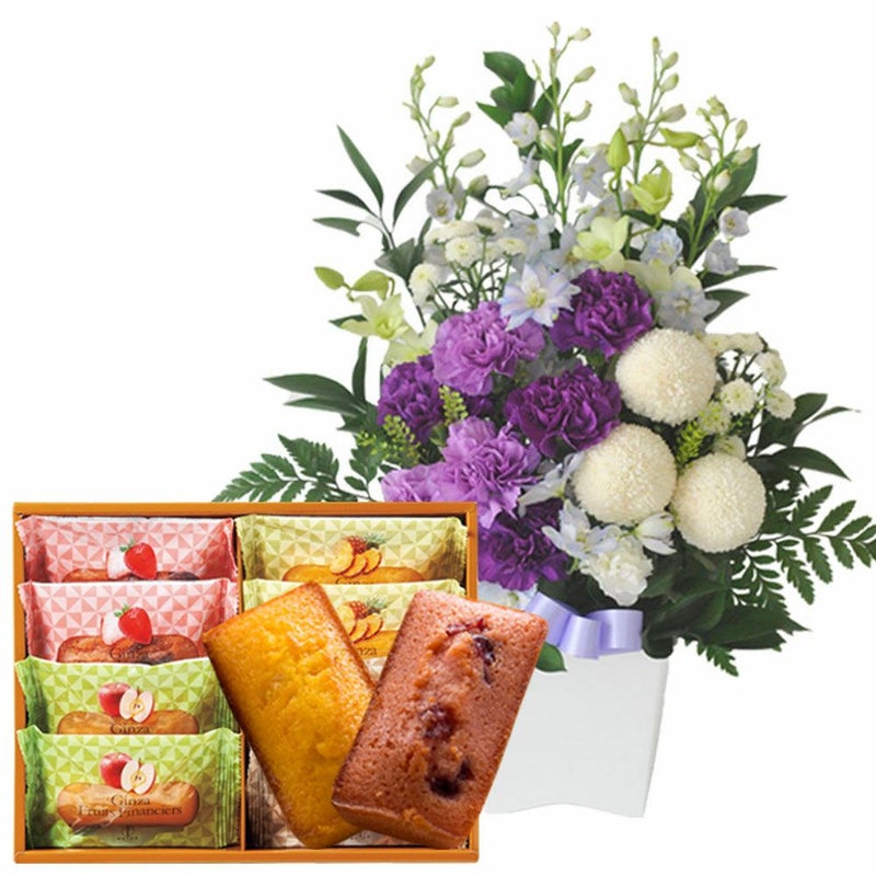 花とスイーツのセット ムーンダストを使ったお供えアレンジメントMサイズ+【銀座千疋屋】フルーツフィナンシェセット 生花 FKAASW