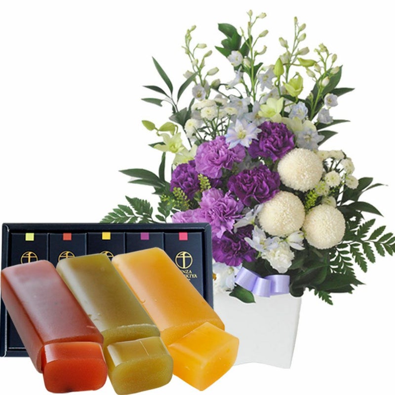 花とスイーツのセット ムーンダストを使ったお供えアレンジメントMサイズ+【銀座千疋屋】フルーツ羊羹セット  生花 FKAASW