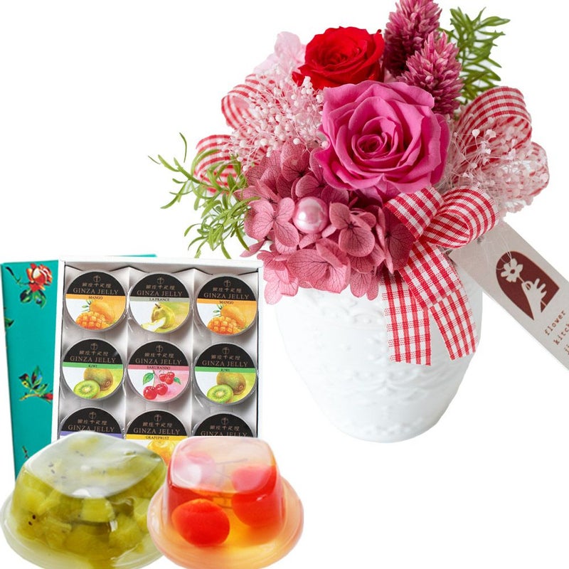 プリザーブドフラワー「ポーレット(チェリーピンク)」+ 銀座千疋屋 銀座ゼリー9個入り  FKTPHSW