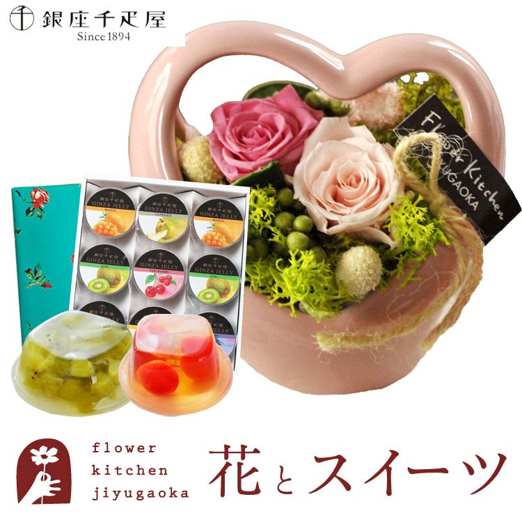 プリザーブドフラワー「チャーミングハート(ピンク)」+ 銀座千疋屋 銀座ゼリー9個入り  FKTPHSW