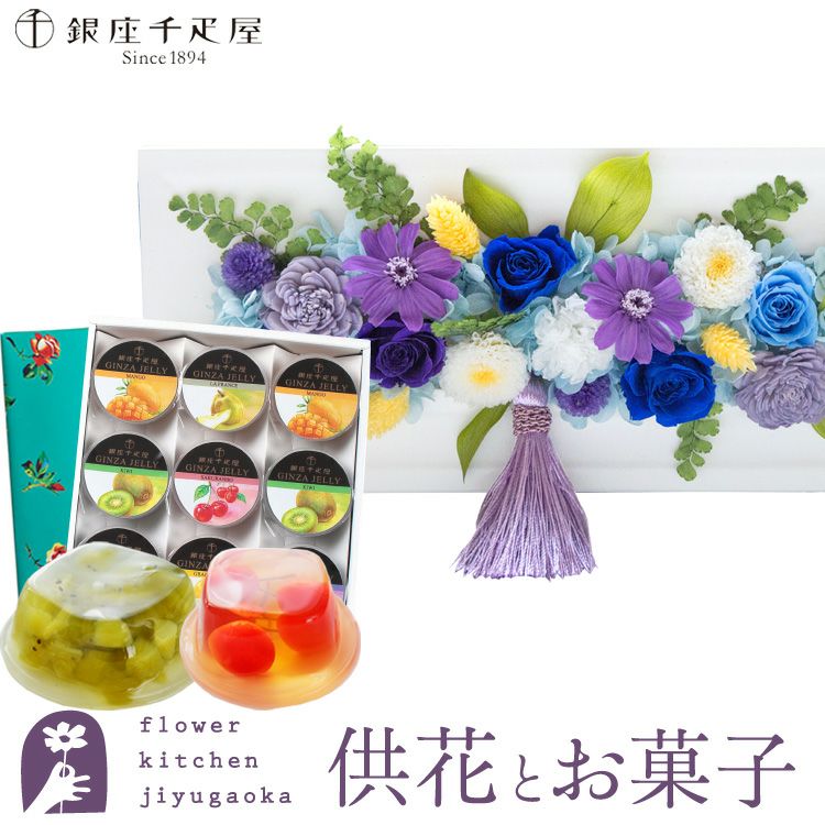 お供えフレームプリザ「白・青紫系MIX」+ 銀座千疋屋 銀座ゼリー9個入り FKTPOSW
