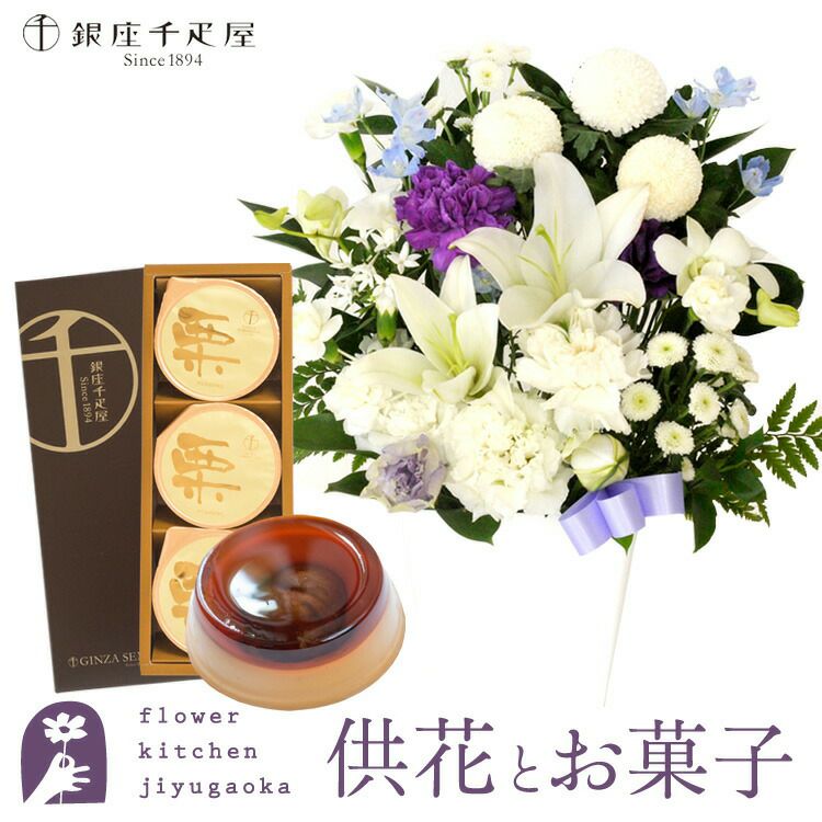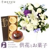 洋花を使った ユリのお供えアレンジMサイズ+銀座千疋屋 銀座マロンプリン3個入  生花 FKAASW