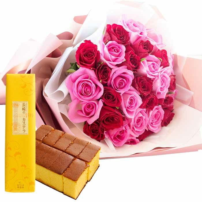 30本バラ花束+長崎カステラ蜂蜜0.5号 10切入 セット 生花 FKAASW