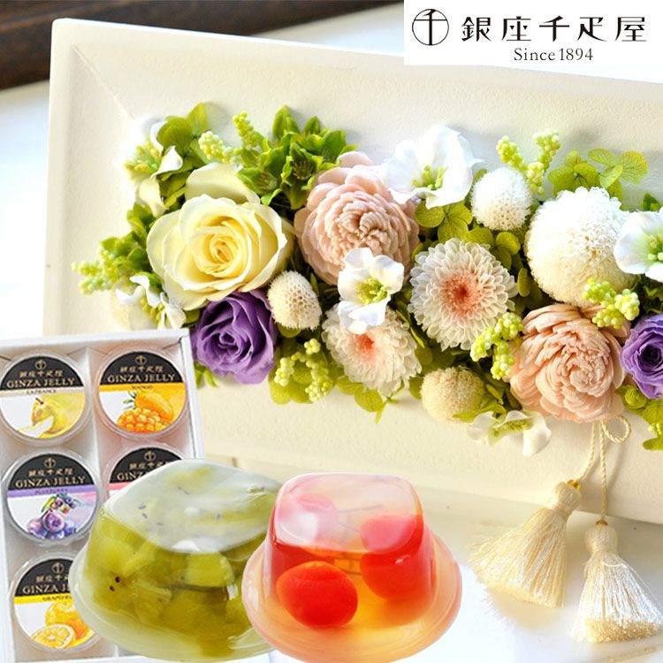 【お供え】お供えフレームプリザ(淡ミックス)と【銀座千疋屋】銀座ゼリー6個入りセット FKTPOSW