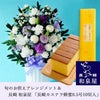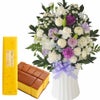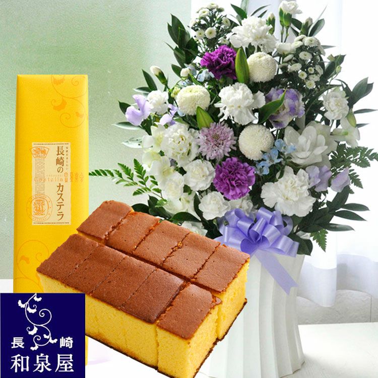 洋花を使った旬のおまかせ お供え花「かすみアレンジ」+長崎和泉屋 長崎カステラ蜂蜜 0.5号 10切入 生花 FKAASW