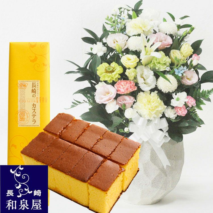 洋花を使った旬のおまかせ お供え花「鞠花アレンジ」+長崎和泉屋 長崎カステラ蜂蜜 0.5号 10切入 長崎和泉屋 カステラ 生花 FKAASW