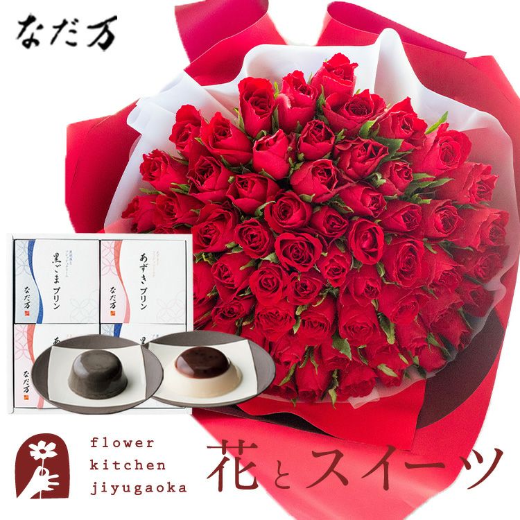 バラ60本花束「レッド」+「なだ万」和風プリンセット あずきプリン 黒ごまプリン 生花 FKAASW