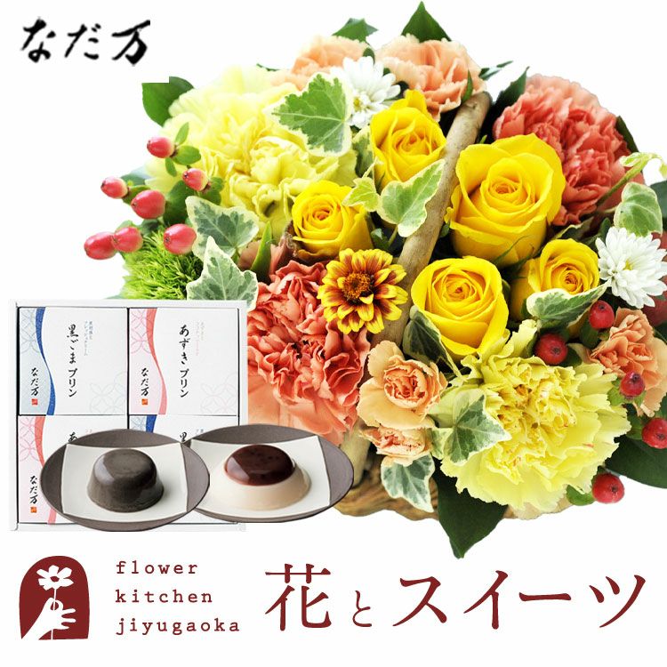ミニョンバスケット【イエロー】+「なだ万」和風プリンセット あずきプリン 黒ごまプリン 生花 FKAASW