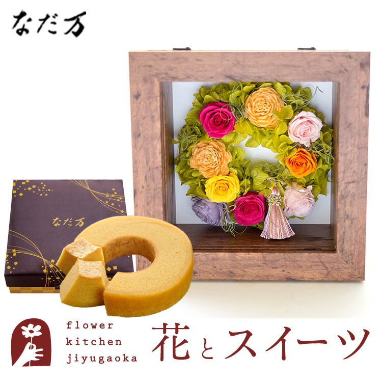 花&スイーツのギフト プリザーブドフラワーフレーム 「ピュルテ」と 「なだ万監修」和三盆バウムクーヘンセット FKTPHSW