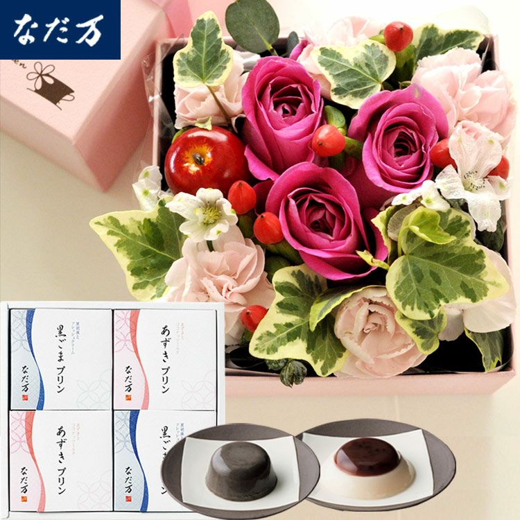 【四角フラワーボックス】MサイズBOX++「なだ万」和風プリンセット あずきプリン 黒ごまプリン 生花 FKAASW