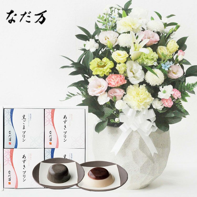 洋花を使った旬のおまかせ お供え花「鞠花アレンジ」+「なだ万」和風プリンセット 生花 FKAASW