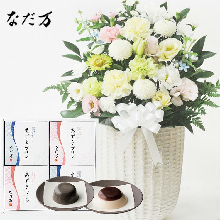 洋花を使った旬のおまかせ お供え花「風月アレンジ」+「なだ万」和風プリンセット 生花 FKAASW