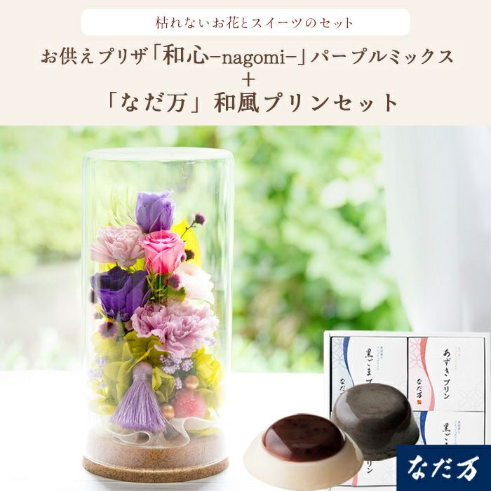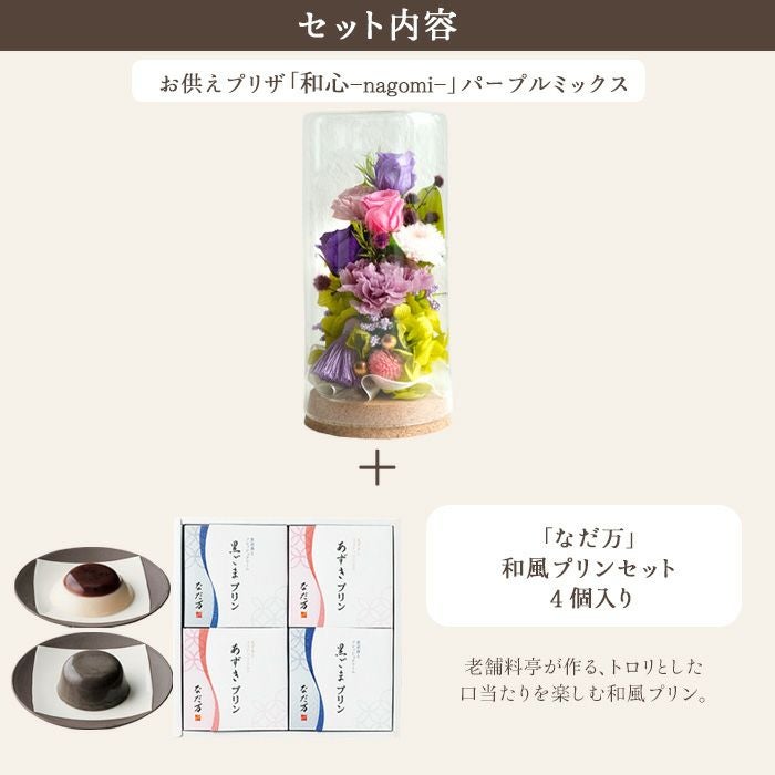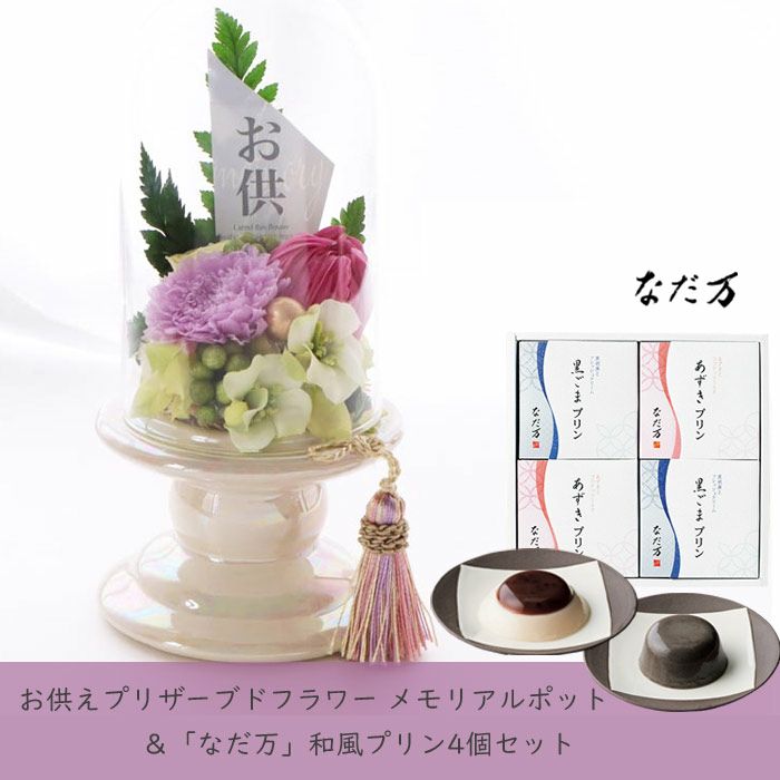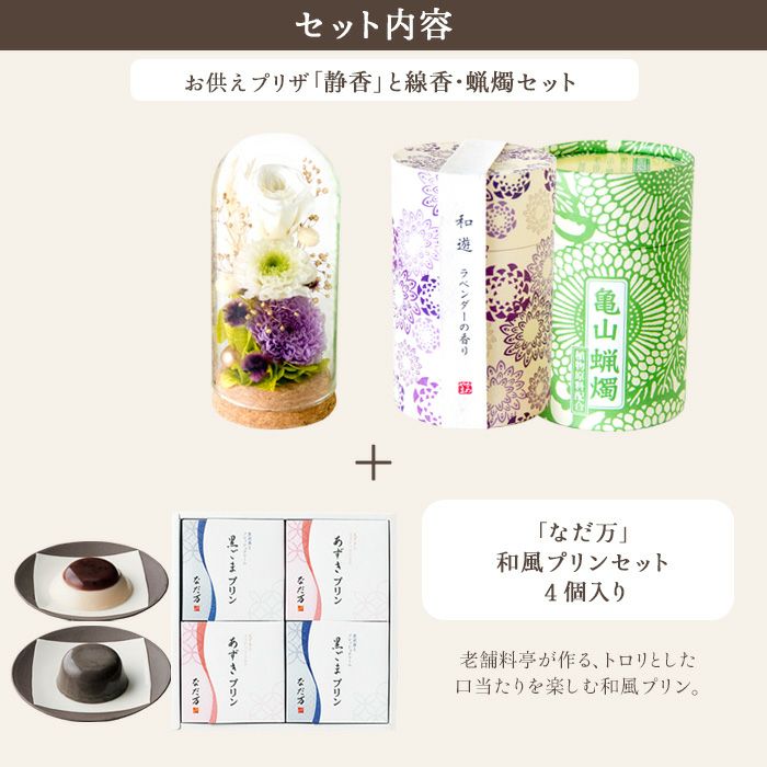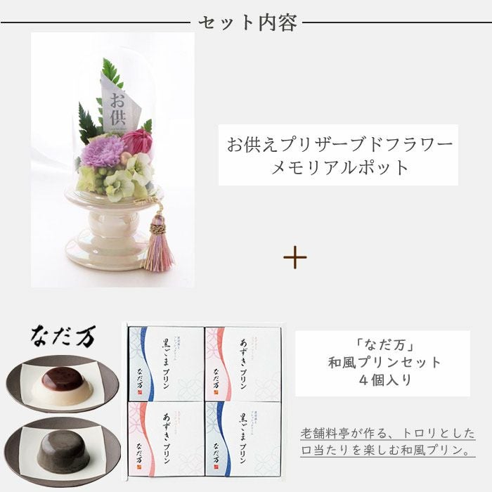 【お供え】お供えプリザーブドフラワー「静香」 と『和遊』ローソク線香セット+「なだ万」和風プリンセット あずきプリン 黒ごまプリン 4個セット FKTPOSW