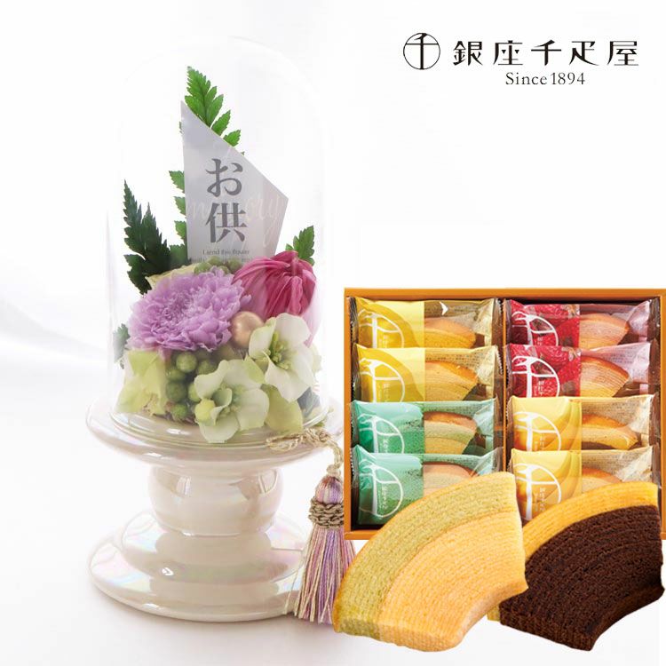 【お供え】お供えプリザーブドフラワー 『メモリアルポット』+【銀座千疋屋】銀座フルーツクーヘン8個入セット FKTPOSW