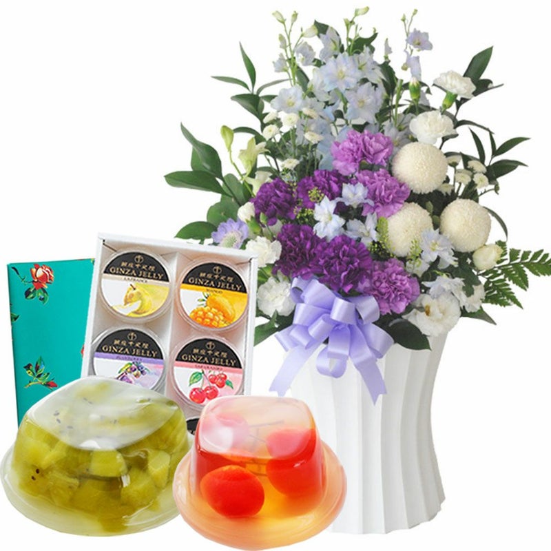 花とスイーツのセット ムーンダストを使ったお供えアレンジメントLサイズ+【銀座千疋屋】銀座フルーツゼリー6個入りセット 生花 FKAASW
