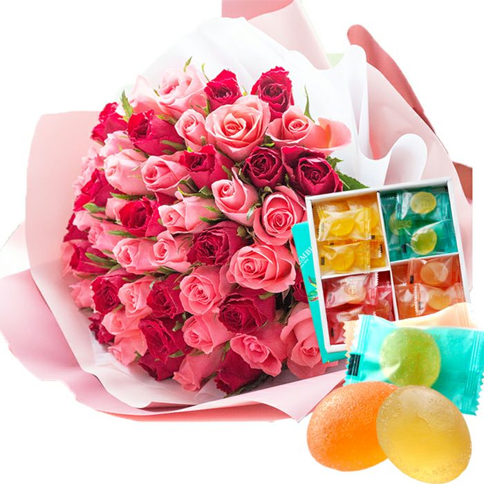 バラ50本花束「レッド×ピンク」バイカラーラッピング+【銀座千疋屋】ひとくちフルーツゼリーセット 生花 FKAASW