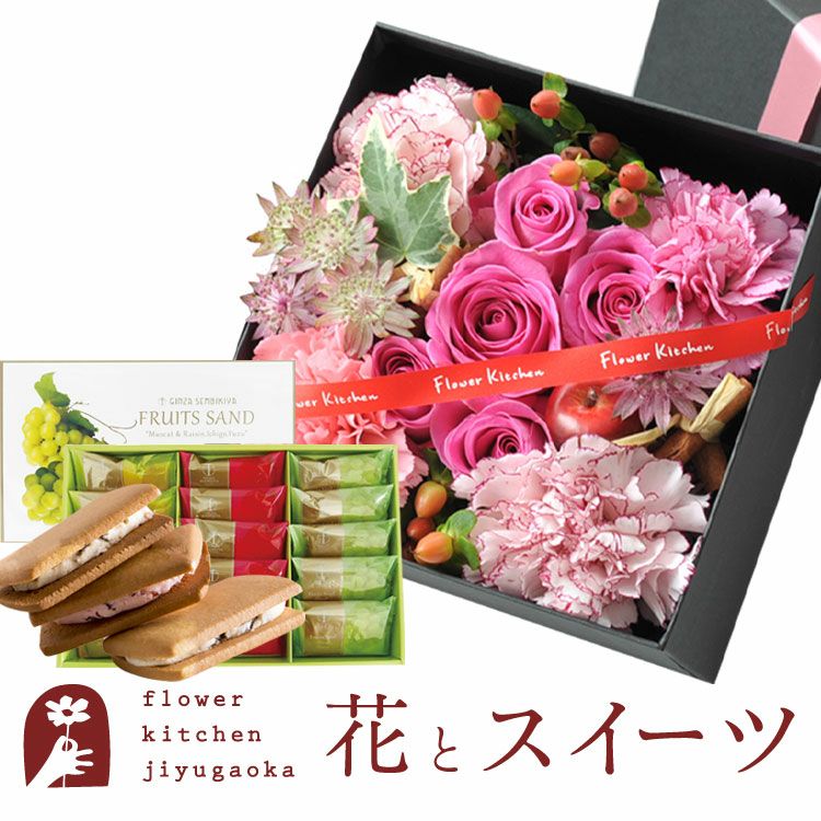 四角BOXLサイズアレンジメント+銀座千疋屋 銀座フルーツサンド 生花 FKAASW
