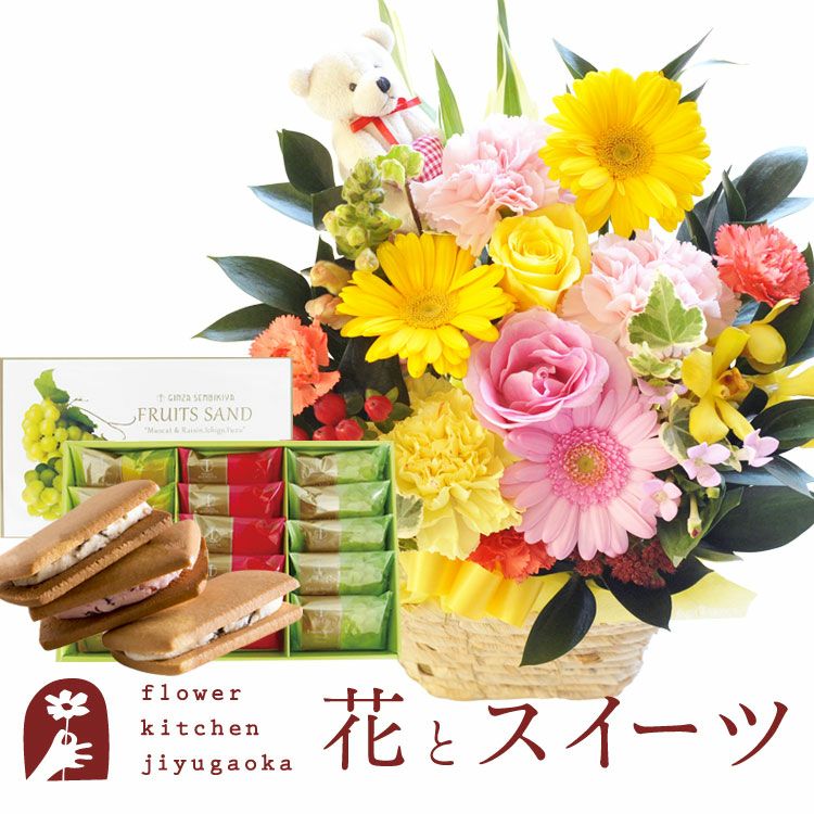 ピック付き季節のフラワーギフト【ミックス】+銀座千疋屋 銀座フルーツサンド 生花 FKAASW