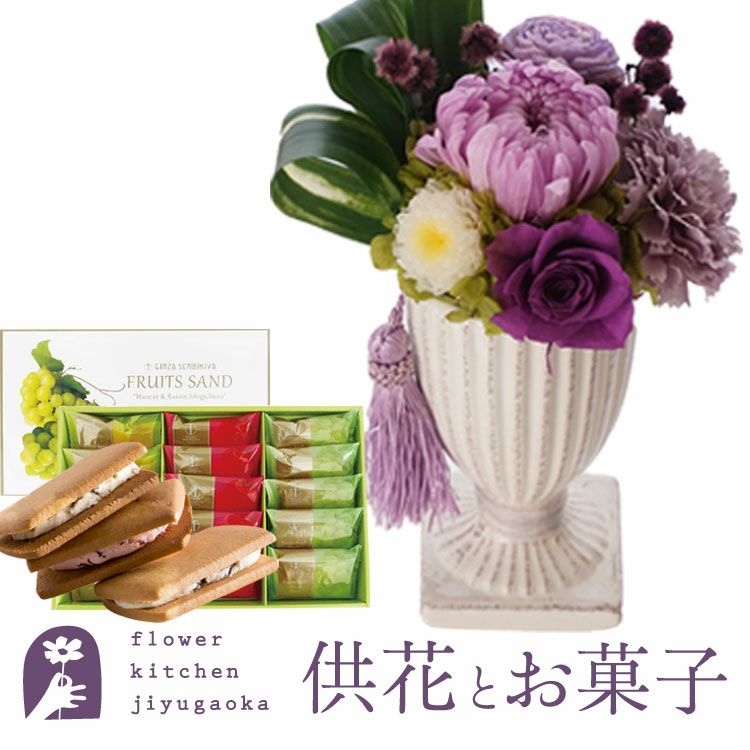 お供えプリザーブドフラワー「花ごろも」パープル+ 銀座千疋屋 銀座フルーツサンド FKTPOSW