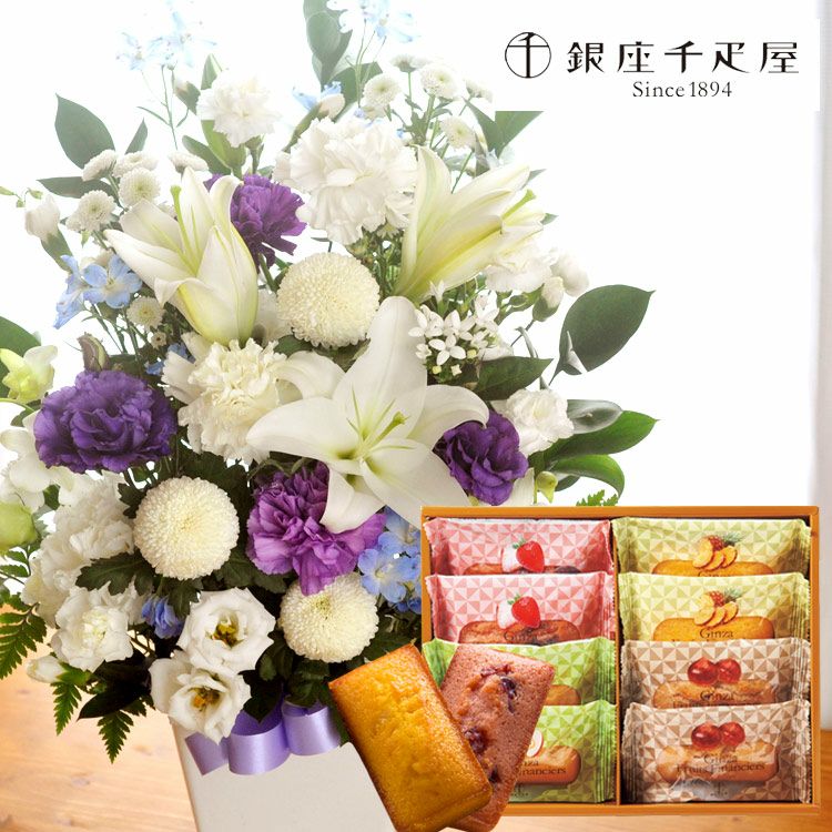 洋花を使った旬のおまかせ お供え花 Lサイズ+【銀座千疋屋】銀座フルーツフィナンシェセット 生花 FKAASW