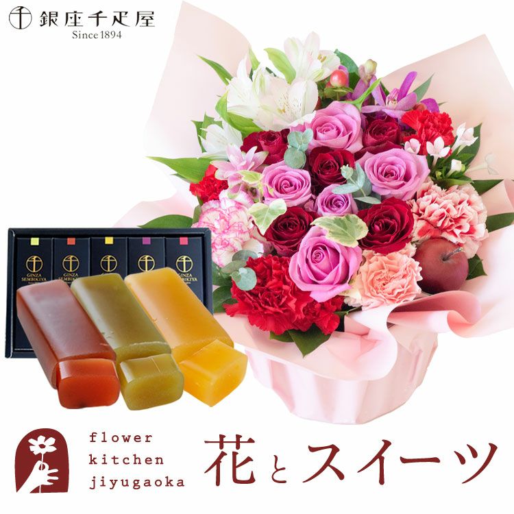 ロゼットアレンジ「ピンクレッド」+【銀座千疋屋】フルーツ羊羹セット 生花 FKAASW