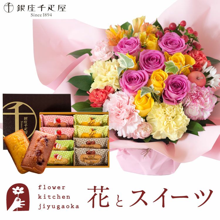 ロゼットアレンジ「ピンクイエロー」+【銀座千疋屋】フルーツフィナンシェセット 生花 FKAASW