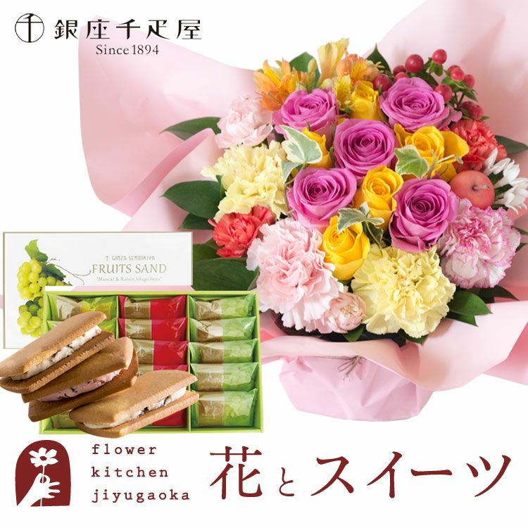 ロゼットアレンジ「ピンクイエロー」+銀座千疋屋 銀座フルーツサンド 生花 FKAASW